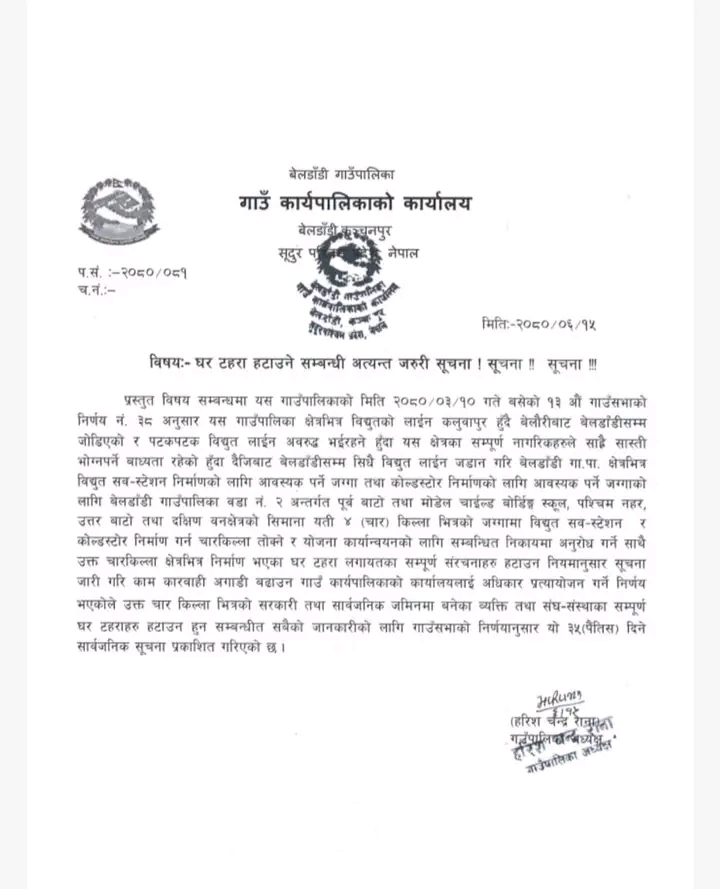 साेमबार आज बेल्डाँडी गाउँपालिका अध्यक्ष हरिशचन्द्र रानाले हस्ताक्षर गरिएको विज्ञप्तिमा मिति २०८०/०३/१० गते बसेको १३ औं गाउँसभाको निर्णय नं. ३८ अनुसार यस गाउँपालिका क्षेत्रभित्र विद्युतको लाईन कलुवापुर हुँदै बेलौरीबाट बेलडाँडीसम्म जोडिएको र पटकपटक विद्युत लाईन अवरुद्ध भईरहने हुँदा यस क्षेत्रका सम्पूर्ण नागरिकहरुले साह्रै सास्ती भोग्नपर्ने बाध्यता रहेको हुँदा दैजिबाट बेलडाँडीसम्म सिधै विद्युत लाईन जडान गरि बेलडाँडी गाउँपालिका क्षेत्रभित्र विद्युत सव स्टेशन निर्माणको लागि आवस्यक पर्ने जग्गा तथा कोल्डस्टोर निर्माणको लागि आवस्यक पर्ने जग्गाको लागि बेलडाँडी गाउँपालिका वडा नं. २ अन्तर्गत पूर्व बाटो तथा मोडेल चाईल्ड बोर्डिङ्ग स्कूल, पश्चिम नहर, उत्तर बाटो तथा दक्षिण वनक्षेत्रको सिमाना यती ४ (चार) किल्ला मित्रको जग्गामा विद्युत सब स्टेशन र कोल्डस्टोर निर्माण गर्न चारकिल्ला तोक्ने र योजना कार्यान्वयनको लागि सम्बन्धित निकायमा अनुरोध गर्ने साथै उक्त चारकिल्ला क्षेत्रभित्र निर्माण भएका घर टहरा लगायतका सम्पूर्ण संरचनाहरु हटाउन नियमानुसार सूचना जारी गरि काम कारवाही अगाडी बढाउन गाउँ कार्यपालिकाको कार्यालयलाई अधिकार प्रत्यायोजन गर्ने निर्णय भएकोले उक्त चार किल्ला भित्रको सरकारी तथा सार्वजनिक जमिनमा बनेका व्यक्ति तथा संघ संस्थाका सम्पूर्ण घर टहराहरु हटाउन हुन सम्बन्धीत सबैको जानकारीको लागि गाउँसभाको निर्णयानुसार यो ३५ (पैतिस) दिने सार्वजनिक सूचना प्रकाशित गरिएको छ ।