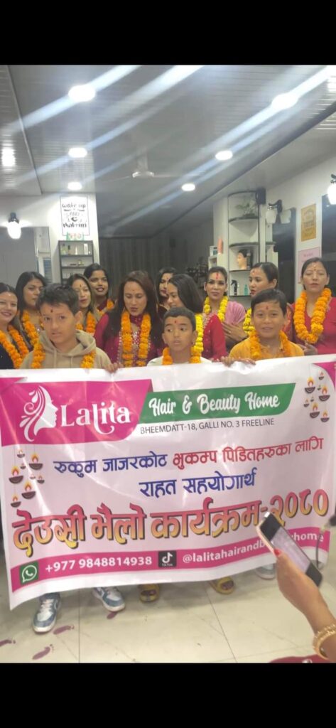 कञ्चनपुर/पुस १९ । कञ्चनपुर महेन्द्रनगर बजारको गल्ली नं ३ मा रहेको ललिता हेयर एण्ड ब्युटीपार्लरले तिहारमा देउसी भैलो खेलेर उठेको रकम सामाजिक कार्यमा खर्च गरेका छन् ।
