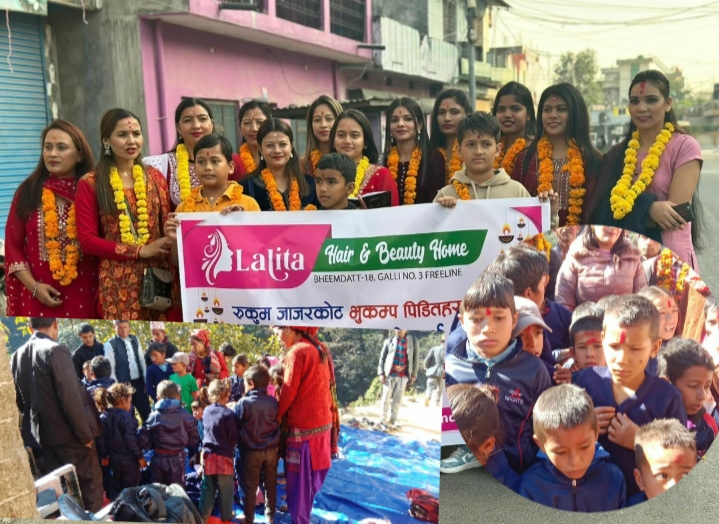 भीमदत्त नगरपालिका महेन्द्रनगर बजारको गल्ली नं ३ फ्रीलाइनमा रहेको ललिता हेयर एण्ड ब्युटीपार्लरको आयोजनामा देउसी भैलोबाट सङ्कलन भएको रकम रकम जाजरकोटमा भूकम्प पीडित आर्थिक विपन्न,जेहेन्दार ४० जना विद्यार्थीहरुलाई ट्र्याक सुट,सुइटर लुगाहरू समाजिक कार्यकर्ता चन्द्रा एर मार्फत जाजरकोट पठाएर वितरण गरेर सहयोग गरेको ललिता हेयर एण्ड ब्युटी पार्लर सञ्चालक कविता नेगी एरले बताएकी छन्।