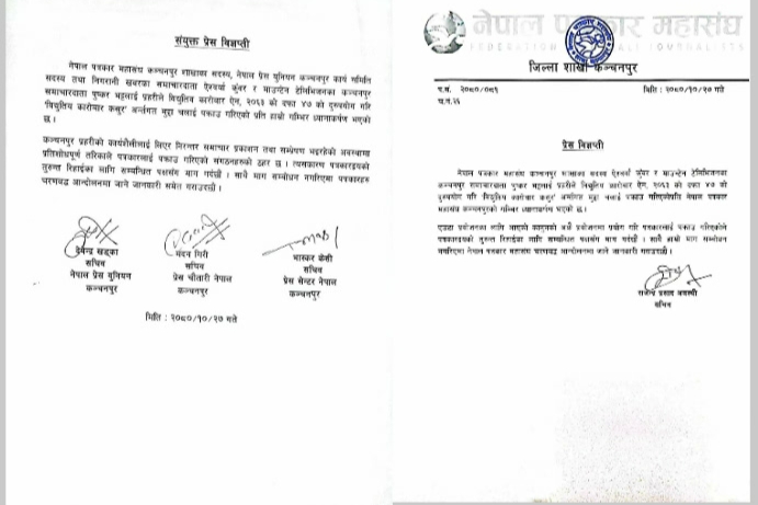 पत्रकार महासंघ सचिव राजेन्द्र प्रशाद अवस्थी, प्रेस यूनियन सचिव देवेन्द्र खडका, प्रेस चौतारी सचिव मदन गिरी र प्रेस सेन्टर सचिव भाष्कर केसीद्वारा हस्ताक्षरित गरिएको विज्ञप्तीमा प्रहरीको कार्यशैलीलाई लिएर निरन्तर समाचार प्रकासित गरिएको विषयमा समाचार लेख्दा प्रतिशोध साध्नका लागि पक्राउ गरेर मुद्दा लगाउन खोजिएको रिहाई गर्न माग गर्दै नगरिए आन्दोलनको चेतवानी दिएका छन । भने, पत्रकारद्वय भट्ट कुँवर, पक्राउ प्रकरणको राजनीतिक दल, तिनका नेता कार्यकर्ताहरु एव नागरिक स्तरबाट समेत बिरोध आईरहेको छ ।